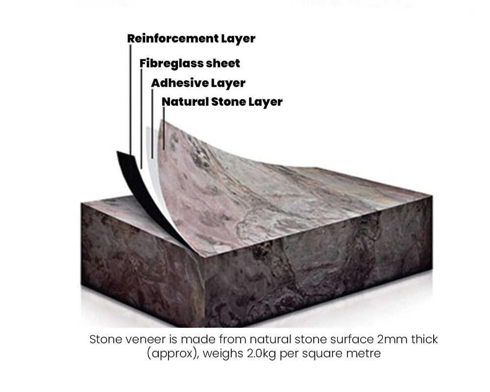 Our natural stone veneer sheets are 1mm to 1.5mm in thickness making them flexible & lightweight. This thin profile allows for easy installation and reduces the weight of the stone, making it suitable for a wide range of applications, including walls, ceilings, furniture, and more.